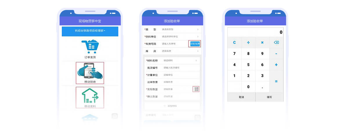 移動驗收系統可移動點收非稱重材料,確保進出場數據的完整可控?,F場物料追蹤系統,通過移動APP實現供應商供貨、進場驗收、出庫發料、庫房盤點的業務替代,在提升現場效率的基礎上實現了業務數據準確、實時的收集,通過數據智能分析實現與供應商對賬、庫房盈虧管控等。
